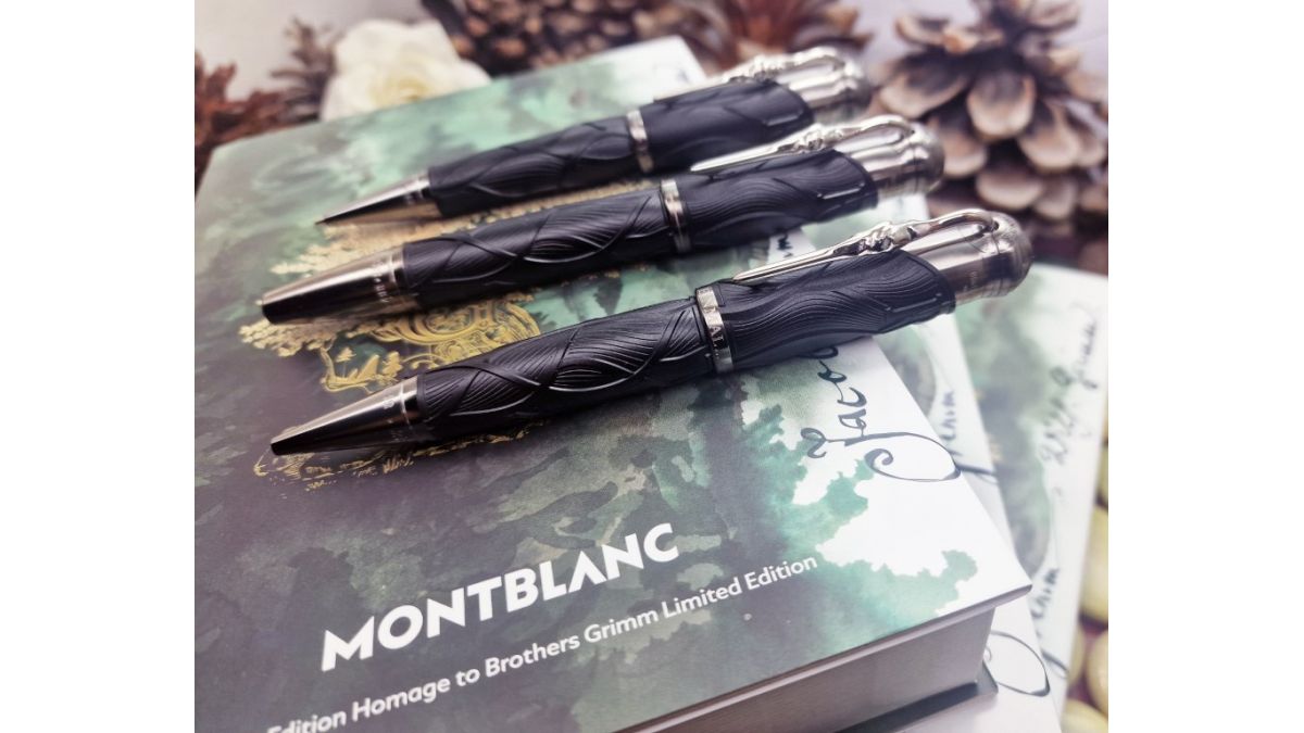 «Érase una vez…» La Edición de Escritores de Montblanc Homage to Brothers Grimm está dedicada a Jacob y Wilhelm Grimm y conmemora su dedicación a los cuentos populares alemanes y europeos, entre los que se encuentran algunos de los cuentos de hadas más famosos como Blancanieves, Cenicienta y La bella durmiente. La forma del artículo de escritura evoca un viejo bastón de caminata y el color negro recuerda la oscuridad de los bosques que suelen ser el escenario principal del folclore de los hermanos Grimm. Además, el diseño ondulado del capuchón y el depósito se inspiran en el pelo de Rapunzel y también se asemejan a unas raíces, ya que los hermanos Grimm consideraban su trabajo lingüístico como una «búsqueda de las raíces». El capuchón está coronado por el emblema Montblanc en resina preciosa. El clip platinado, que recuerda a un gran trozo de madera, revela sorprendentemente la silueta del perfil de los hermanos Grimm al girarlo.
